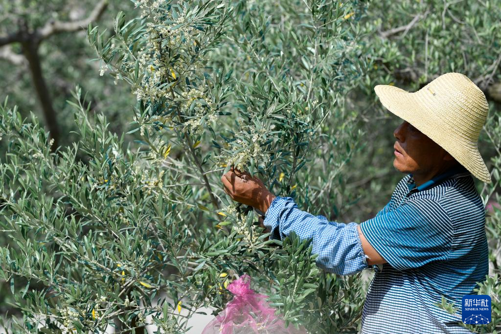 5月17日,在隴南市武都區(qū)漢王鎮(zhèn)的祥宇國家級萬畝有機油橄欖種植示范基地,果農(nóng)觀察油橄欖開花情況。