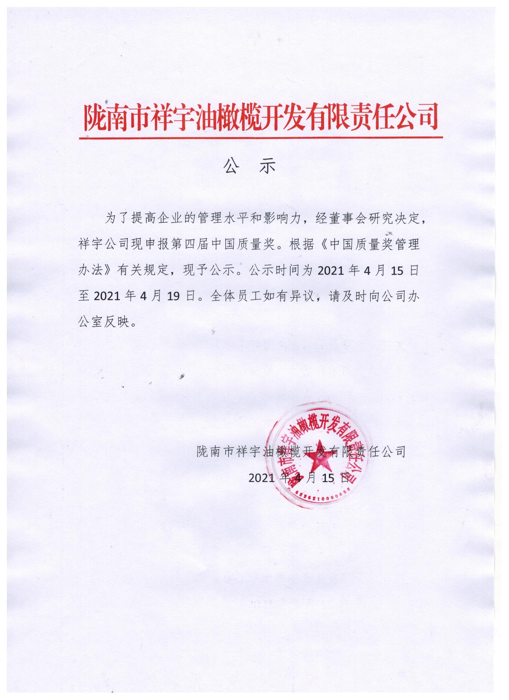 隴南市祥宇油橄欖開發(fā)有限責(zé)任公司關(guān)于申報(bào)第四屆中國質(zhì)量獎(jiǎng)的公示