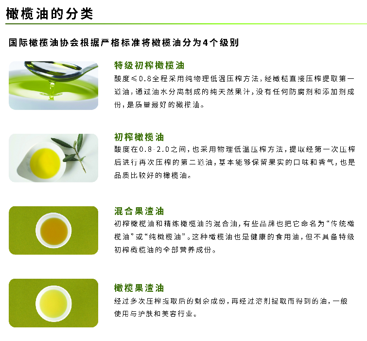 國際橄欖油協(xié)會根據(jù)嚴(yán)格標(biāo)準(zhǔn)將橄欖油分為4個級別: