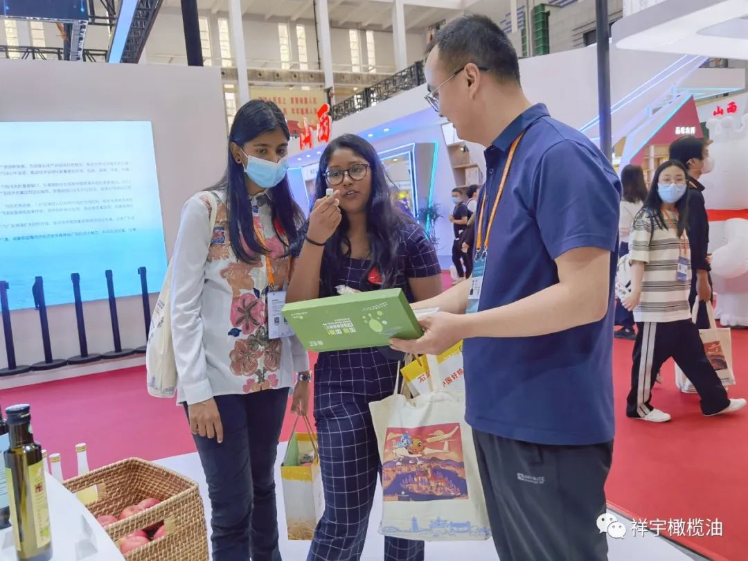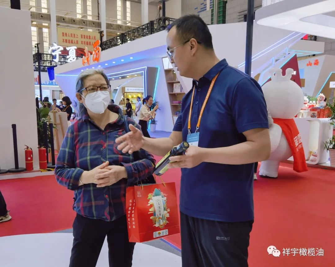 展會現場,來賓、客商紛紛到祥宇橄欖油展臺前駐足品鑒,